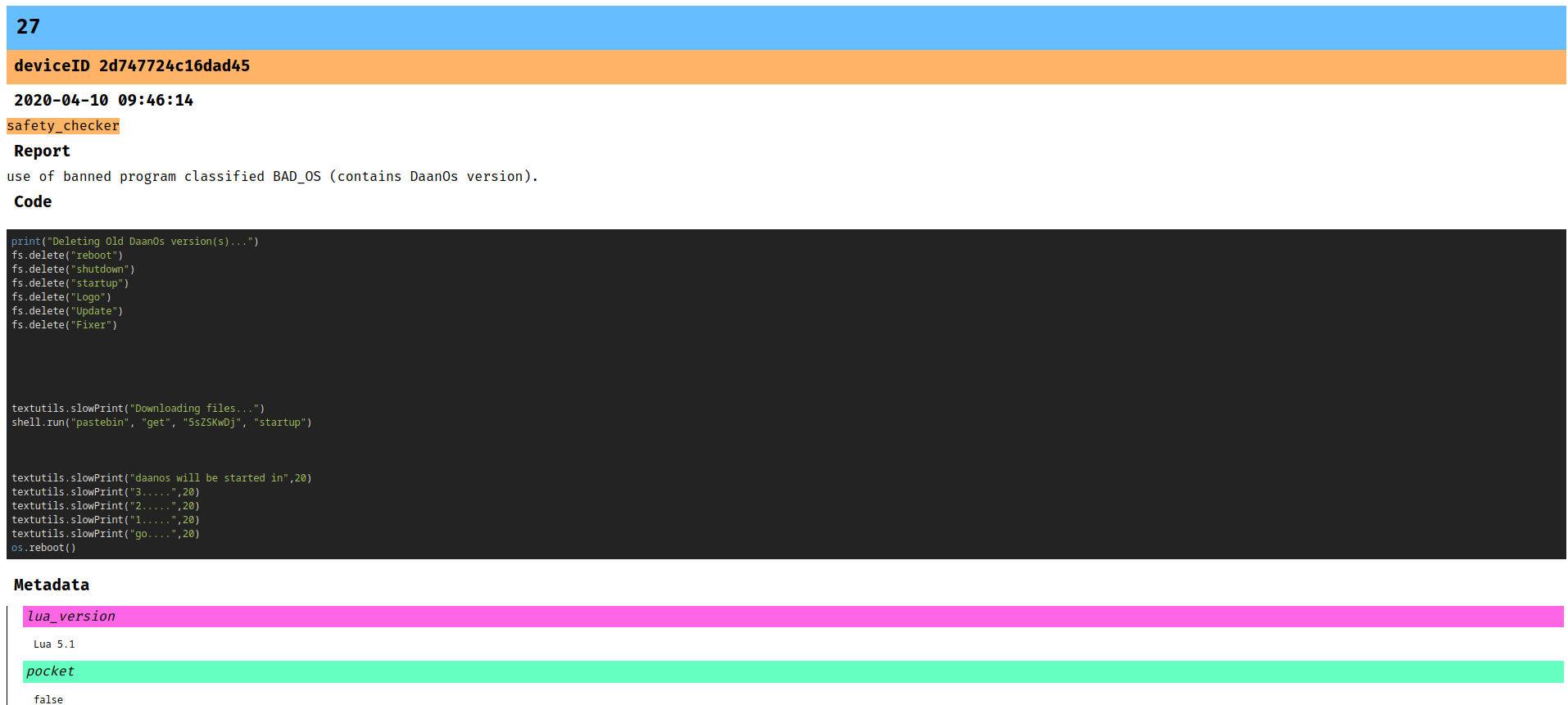Called SPUDNET/PIR (PotatOS Incident Reports), this feature is used to report incidents from PotatOS systems on which incidents have occurred. This also functions as an automatic tracing system for detecting some buggy behaviour. Incidents are reported via a dedicated HTTP endpoint, and as well as the basic incident description PotatOS sends a code sample - generally the code most recently run by the relevant computer - and other metadata, such as a set of tags, reported computer ID and label, PotatOS build, stack trace, ComputerCraft version, adjacent peripherals, PotatOS UUID and logs, and other configuration. This is used to assist with debugging and to identify relevant computers.